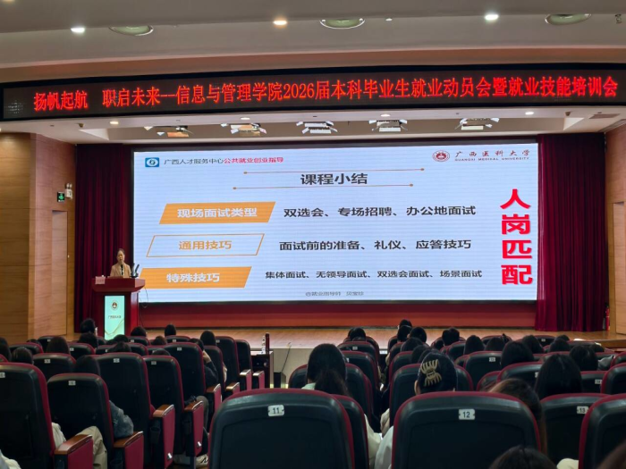 为助力2026届本科毕业生明确就业方向、提升就业竞争力,2025年11月7日上午,太阳成集团tyc234cc于太阳成集团tyc234cc校本部科技楼报告厅召开“扬帆启航,职启未来”—2026届本科毕业生就业动员会暨就业技能培训会。公司党委副书记蒋鹏、2023级辅导员陈婉新、毕业班辅导员谭艳红、广西南宁贝塔栖商务服务有限公司项目总监贝宝珍及全体2026届本科毕业生参加本次活动。