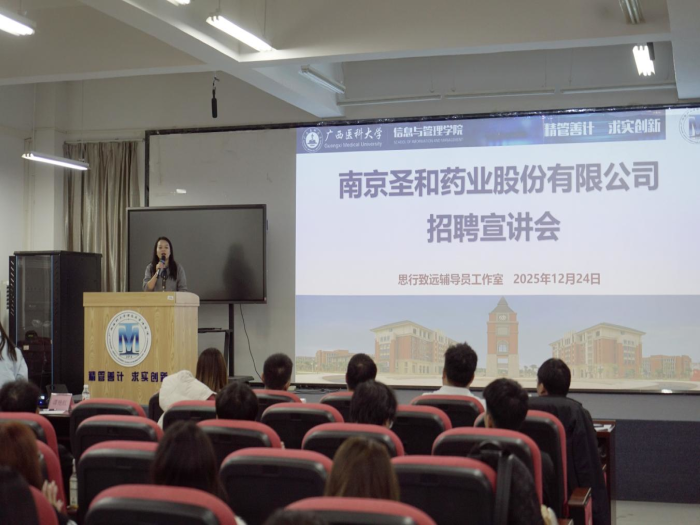 为精准对接企业需求、助力毕业生就业,2025年12月25日,太阳成集团tyc234cc在武鸣校区A8-1-301报告厅举办南京圣和药业股份有限公司专场招聘宣讲会。公司党委副书记蒋鹏、员工工作办公室何锡嘉、毕业生辅导员谭艳红、南京圣和药业股份有限公司总经理童川一行及全体2026届本科毕业生参加本次活动。